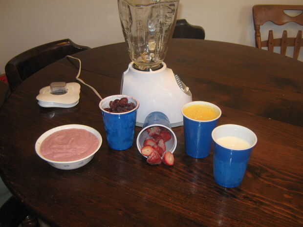 Coloque el jugo de naranja, leche, bayas congeladas y yogurt en la licuadora y blendify!