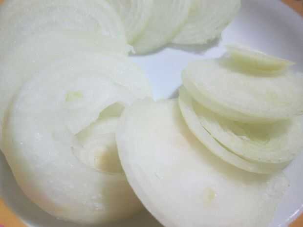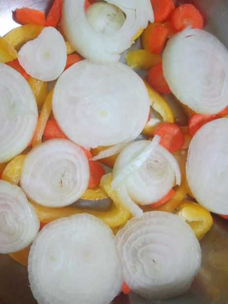 Pelar la cebolla, cortar en rodajas y repartirlos sobre el pimiento y las zanahorias.