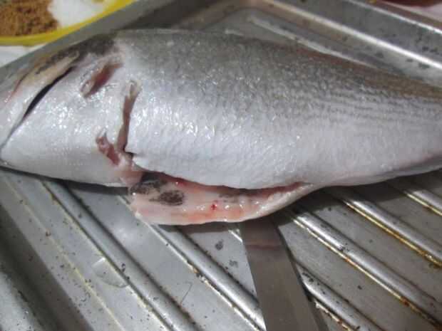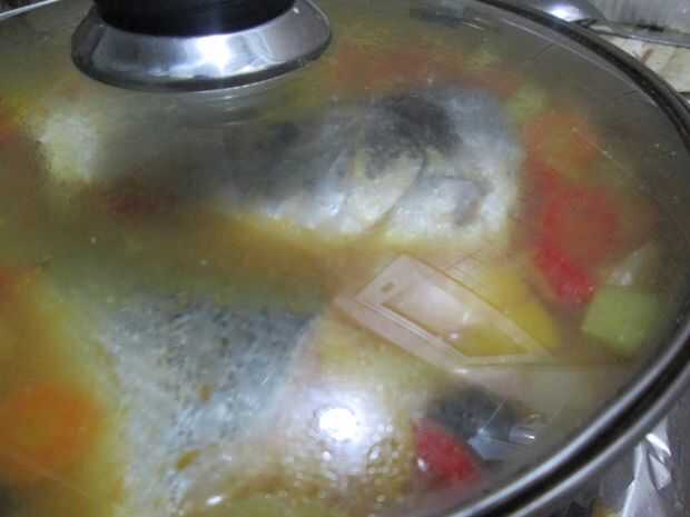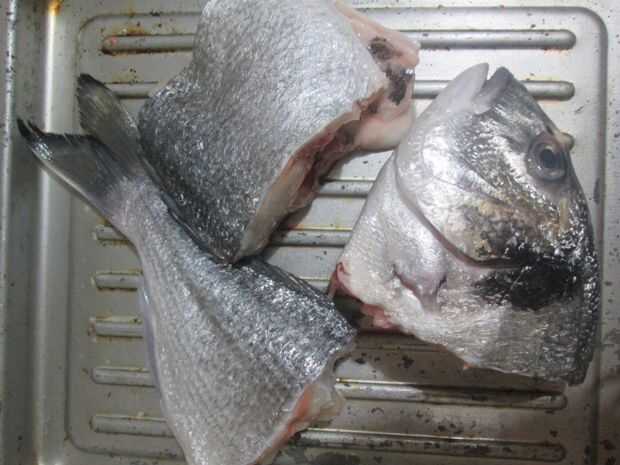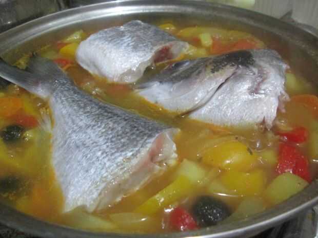 Escala la Brema, limpiar la cavidad abdominal y quitar las aletas pectorales y cortarlo en 3 partes. Agregar las piezas al guiso de verduras, asegúrese de que está totalmente sumergidos. Tapa y deja cocinar durante 10-15 minutos a fuego medio-bajo.