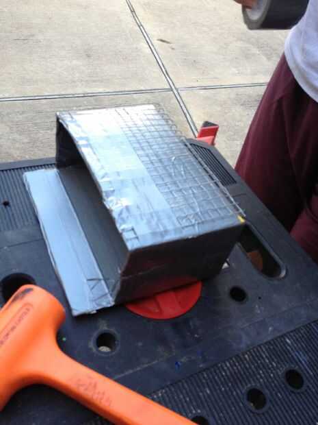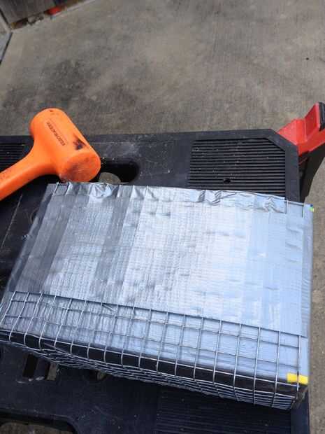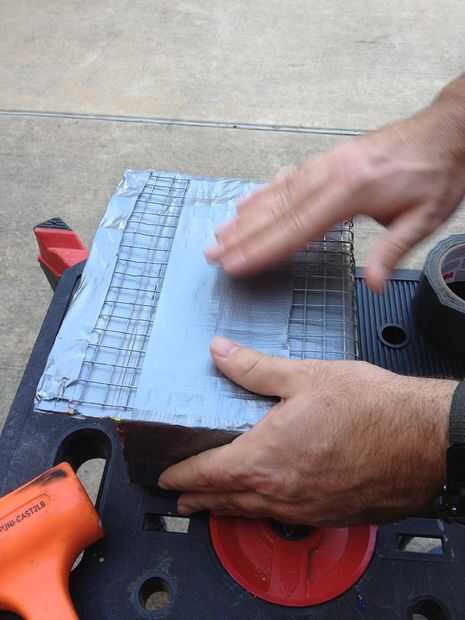 La malla en la espalda, parte inferior y delantera de la caja de la cinta. Están reforzando la caja de cartón con una cinta adhesiva / malla / sandwich de cinta del conducto. Mantener la cinta agradable y suave frotando hacia fuera las arrugas y burbujas de aire en el camino.