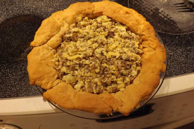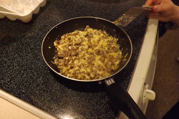 Utilizando la misma sartén que se cocina el chorizo, mezclar 5 huevos. Puede añadir algunas salchichas en los huevos para la mezcla de sabor extra. Una vez que se hacen los huevos coloca-junto con la salchicha-en la corteza.
