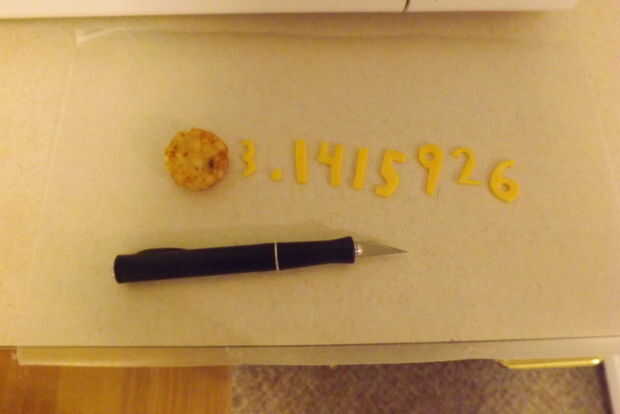 Para hacer el π grande en el centro de la tarta, he utilizado tres trozos de tocino.