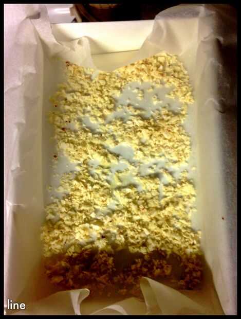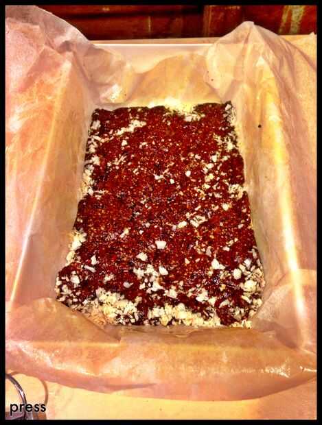 Línea de un recipiente seguro de microondas con pergamino. Espolvoree 1/2 del coco reservado para cubrir el pergamino bastante uniformemente. Romper pedazos de la superfruta relleno sobre el coco y presionar en el molde para crear una capa uniforme de la mezcla de fruta. Usted presiona con pergamino adicional para mantener las manos limpias.