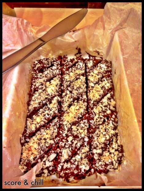 Deje que el chocolate se enfríe un par de minutos, luego use un cuchillo para marcar los dulces en su forma y tamaño.