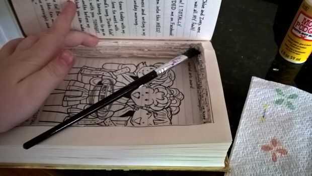 Llevará pegamento líquido y pintar sobre las páginas comprimidas de su espacio oculto en el interior y el exterior. Ahora sentarse en él para asegurarse de que el pegamento se seca y las páginas de estancia agradable y plana.