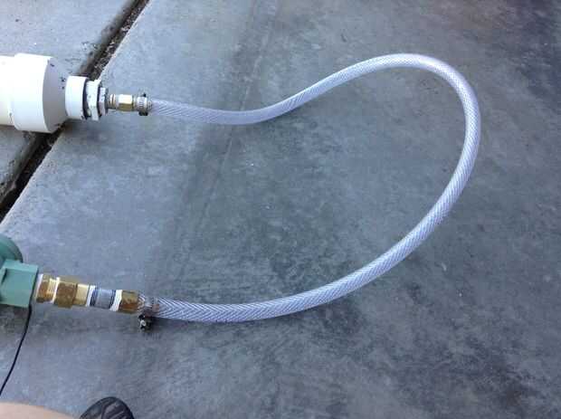 Necesita manguera de nylon trenzado con 1/2 pulgada de diámetro interior y creo que 5/8 de diámetro externo y dos (aún no recuerda el tamaño) abrazaderas para manguera