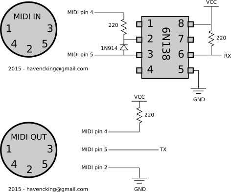 Mi camino final para mejorar la parte MIDI de mi dispositivo original de Arduino es construir el hardware de componentes en vez de usar un escudo Linksprite MIDI. La ventaja de hacer que esto es que puede ser agregado a un proto-board con otras funcionalidades como codificadores y un display y panel montaron puertos MIDI puede ser utilizada. Es un esquema del circuito que utiliza. Para referencia, aquí está la especificación eléctrica oficial. Tenga en cuenta que llama para un resistor conectado al MIDI out pin 5. He encontrado que la resistencia reduce el nivel de voltaje de los datos transmitidos suficientemente que el extremo receptor no pudo leer la it, así que omití la resistencia.