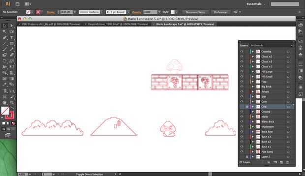 Manualmente trazado las características principales que quería usar la herramienta pluma. Puse cada uno en capas separadas por lo que pude les encendido y activar para exportación fácil más tarde.