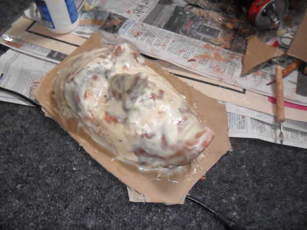 Qué vas a hacer es tapa el yeso y la arcilla se enfrentan en vaselina, entonces tu simplemente vas a tener sentado en un trozo de cartón y cubren de látex, no mucho, solo un buen 2mm de espesor de la capa, luego dejarlo curar en una zona cálida.