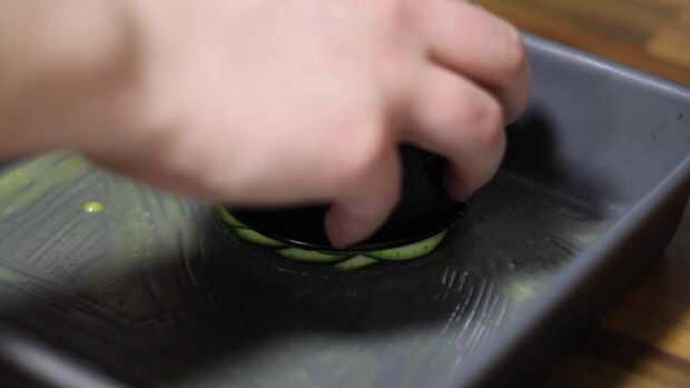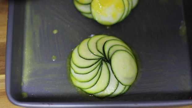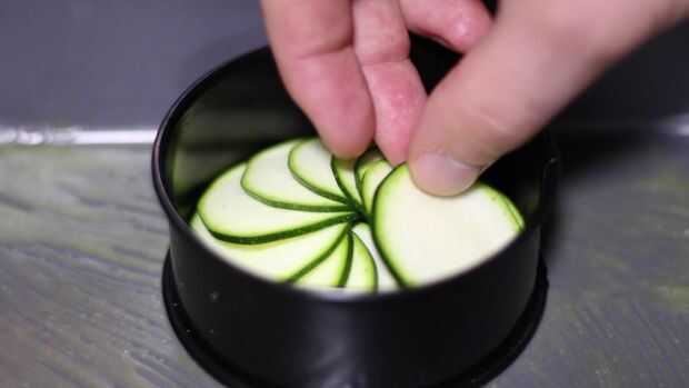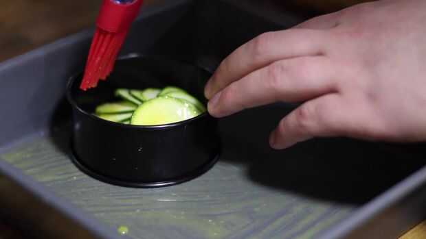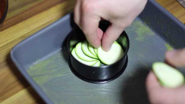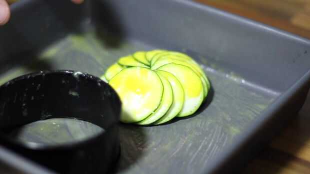 Coloque el calabacín en rodajas finas en una espiral superpuesta dentro del anillo y la parte superior con algunos derrita mantequilla y ponerlas en la parrilla a fuego medio. mantener un ojo sobre ellos como la mantequilla podría quemarse muy rápido pero es que para darle un bonito top oro.