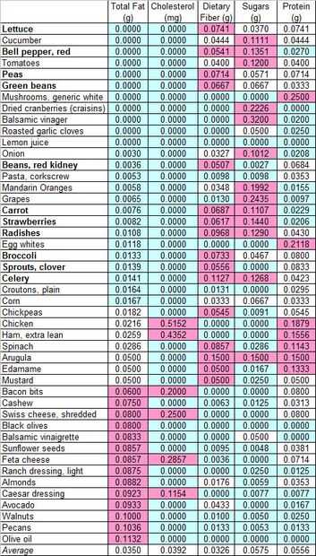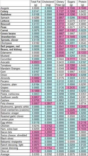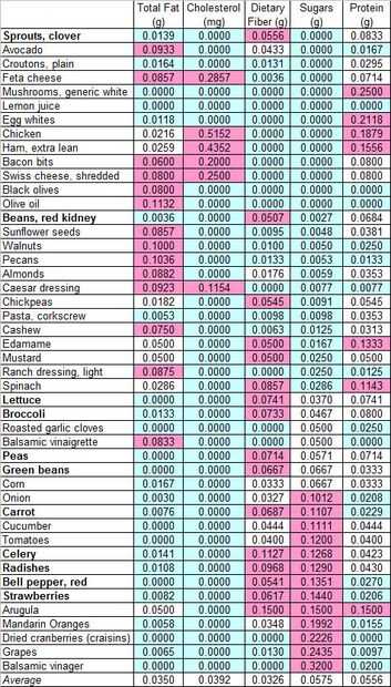 Tome un vistazo a las imágenes de este paso para ver cómo diferentes ingredientes comúnmente encontrado en ensalada recetas compara entre sí. Las cantidades para cada ingrediente son de 1 caloría para que ellos puedan compararon sobre una base por calorías. Números resaltados en azul son en el 25% más bajo, no resaltada (queda blanco) está en la gama media de 25% a 75% de números y números resaltados en rojo en el 25%. Ingredientes con nombres en negrita están en el más bajo 25% de grasa y el 25% de fibra, estos fueron los ingredientes que escogí para hacer mis recetas ensalada giran alrededor.