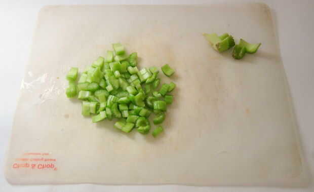 La semilla del pimiento y picar el resto en trozos pequeños, 1/2 pulgada cuadrada. Una pimienta es alrededor de 1 1/2 taza picada.