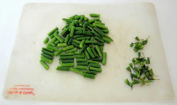 Cortar los extremos (si está dañado) y cortar el resto del tallo en trozos pequeños, aproximadamente de 1/2 pulgada por 1/4 pulgada. Un palo es aproximadamente 1/3 taza picada.