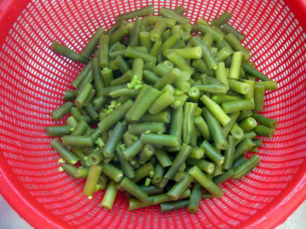 Puedes utilizar judías verdes (drenaje) de una lata, o cocinar tú mismo los frescos (que es lo que prefiero). Para cocerlas, cortarlas en segmentos cortos (aproximadamente 1 pulgada de largo, quitar los extremos), hervirlas en medio-alto de 3 a 4 minutos, escurrirlas y (idealmente) ponerlos en agua con hielo para parar de cocinar. Si haces un lote grande, usted puede congelar los extras en bolsas zip-lock de 1/2 taza (o más) cantidades por lo que son fáciles de agregar rápidamente a la ensalada de tarros más adelante.