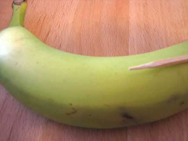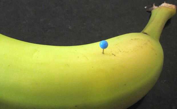 - Suavemente inserte el pin o la aguja a través de la piel del plátano. Es mejor escoger un punto donde ya existe una mancha marrón para ocultar la evidencia