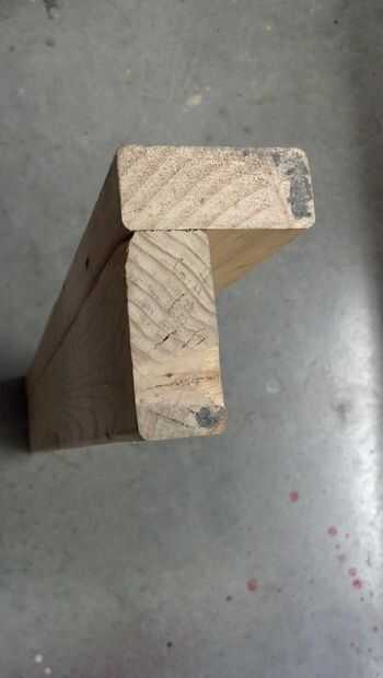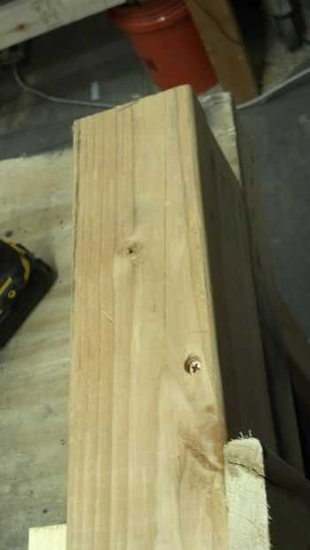 Una vez que los cortes, utilizando un par de abrazaderas de tipo C, sujete el lado corto de 1 1/2" de un tablero para la esquina del lado largo 3 1/2" (un estándar 2 x 4 es realmente de 1 1/2 x 3 1/2, o para ser más precisos 1.525 x 3.525), asegúrese de que Plaza los cabos.