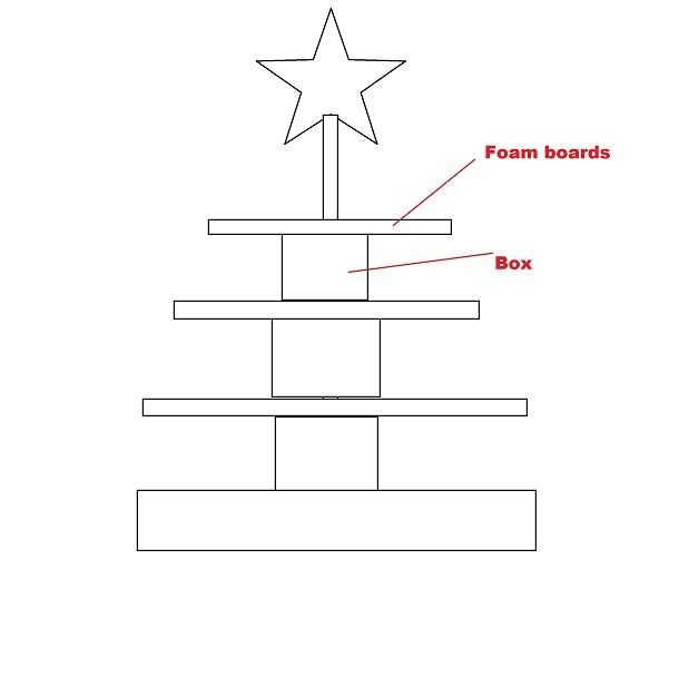Poner la Base que hiciste en el paso 2 en el cuadro inferior en el centro para que los orificios se alineen. Poner el tubo de PVC con la estrella a través de los agujeros centrales de cada capa de la pila. El poste de tubo de PVC impide que los estantes móviles. Asegúrese de que el tubo firmemente se celebra en la base inferior de madera para que el árbol no puede caer.