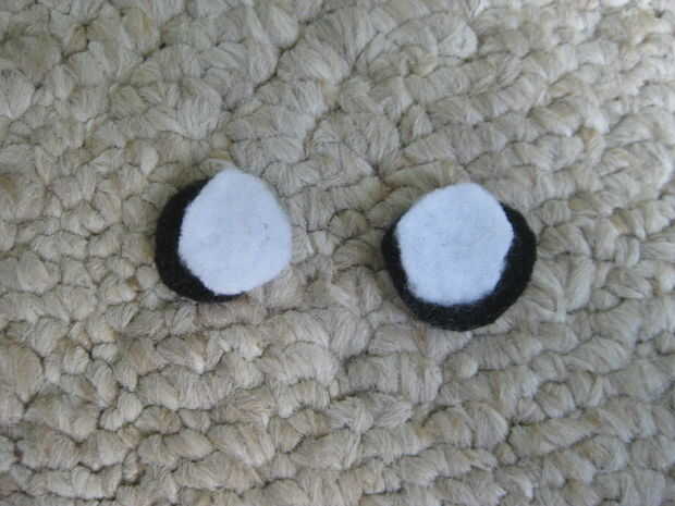 Entonces yo cortar ojos y papada de Jake. Jake de ojos dos círculos de fieltro negro, entonces fueron dos blancos más pequeños círculos de fieltro. La papada era un revés de letra 'u' de la burbuja.