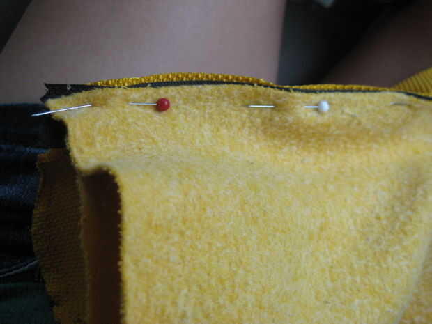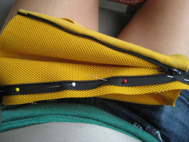 Ahora, dobla la capa externa por lo que sus derechos se enfrentarán. Pin el borde para hacer un sándwich con el forro, la cremallera y la capa externa como en la segunda foto. Coser una vez más paralela a la cremallera.