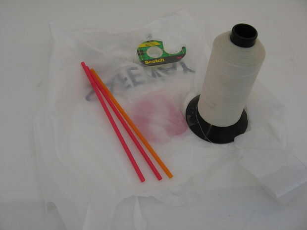 Este proyecto requerirá beber pajas (x3), una bolsa de plástico, poco de cinta scotch, cadena y un lápiz (no fotografiado). Usted también necesitará algunas tijeras.