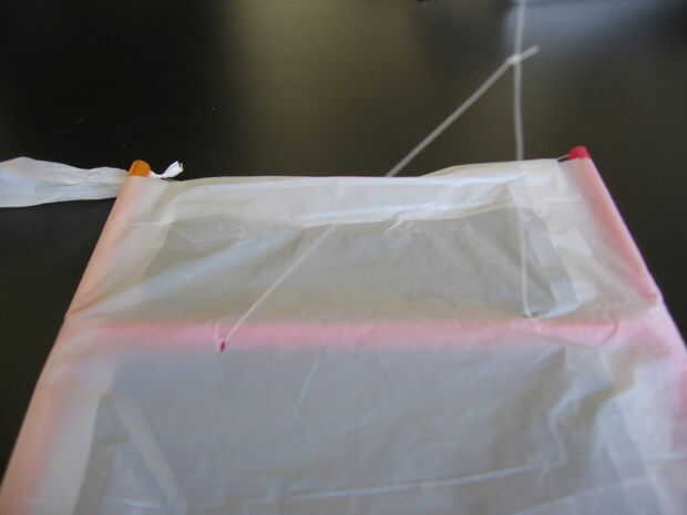 Cortar una longitud de cuerda (20' más o menos) y luego cinta de un extremo a un lápiz. Luego girar el lápiz en las manos para envolver el resto de la cadena alrededor de él. Luego haga un orificio en el plástico de la derecha a lo largo de la paja media hacia un lado de la cometa. Tomar la cuerda que envuelve el lápiz y un extremo de la alimentación a través del orificio desde el lado de paja no. Entonces debería ser capaz de atar la cuerda alrededor de la paja y lo sujetó a la cometa. Ahora, tome un pedazo pequeño de cuerda (6"). Haga otro orificio hacia el borde en el lado opuesto de la cometa. La pequeña cadena en la alimentación desde el lado no de paja y luego atarla a la paja. Tomar el otro extremo de esa cuerda y Átala a la cadena principal. El nudo debe ser capaz de deslizar arriba y abajo, ver la imagen para obtener más información.