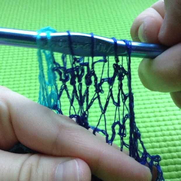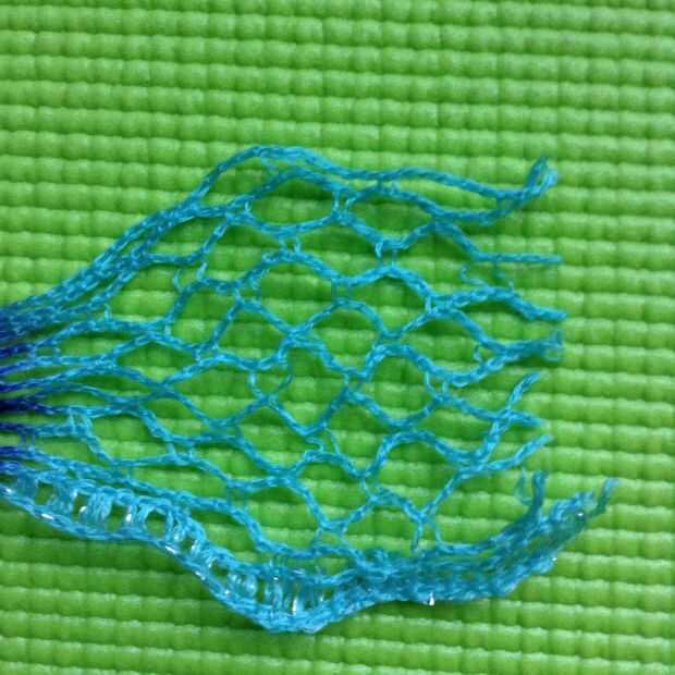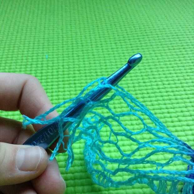 Para este proyecto estará trabajando en la parte superior de este hilo (no la parte metálica en la parte inferior). Al llegar el hilo, te tire para ver el patrón de malla. Para echar, simplemente contar tres agujeros en la parte superior y deslice la cuarta boca sobre su ganchillo de crochet. (Los agujeros muy superiores pueden ser un poco escondidos a menos que se lo separe más). Omitir el siguiente orificio y deslizamiento en el sexto hoyo. Ahora tienes 2 puntadas y tendrá seis. Mantener en fundición sobre el uso de todos los agujeros hasta que tenga seis puntos.