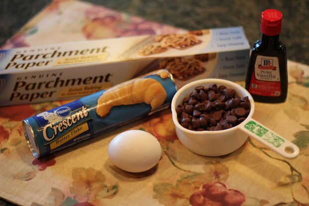 Se reúnen los ingredientes. Un huevo, rollos de una poder de la media luna roja, vainilla, y una taza de chocolate chips. El pergamino no es necesario; solo ayuda con la limpieza. :)