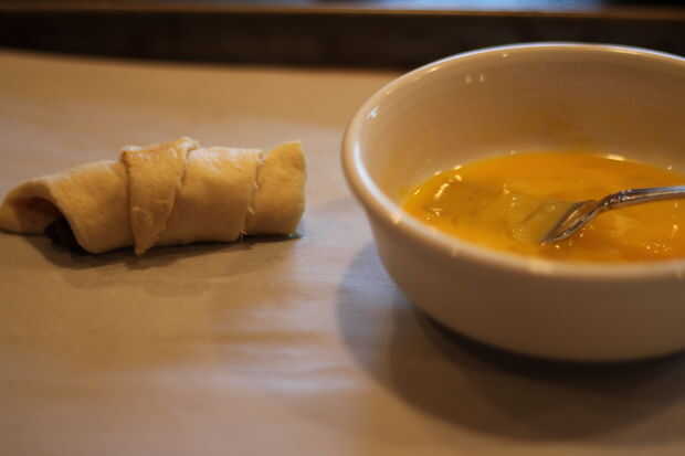 Enrollar su rollo crescent alrededor de sus chips de chocolate. Tiene su huevo batido en un recipiente listo para ir.