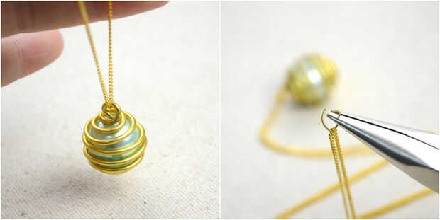 Cortar la cadena, de diapositiva en el colgante de grano de la perla y luego conectar los dos enlaces en los extremos de un lazo completo.