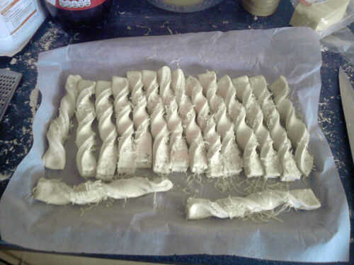 Porque las tiras con huevo en ambos lados, levante cada tira de un solo extremo. El otro extremo debe permanecer pegado al papel de la hornada. Toque unas cuantas veces, luego presione hacia abajo para palillo hacia el papel de la hornada.