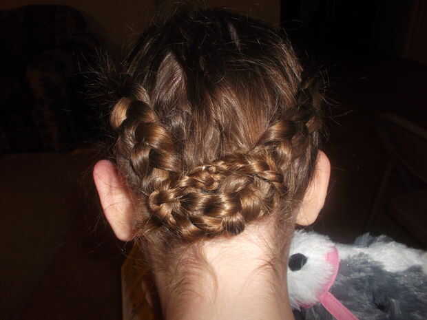 Tome el extremo de la trenza de la izquierda y meter en la trenza que se une a la cabeza para formar un bucle. Utilice las horquillas para fijar la trenza. Repita con la trenza a la derecha. Debe se asemejan vago a un pretzel.