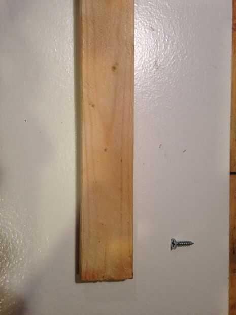 Usted alguna vez ha pasado su tiempo que ubicación exacta de un cuadro de medición o que preciado arte sólo se encuentra no es donde quería? Bueno, aquí es una solución. Encontrar un trozo de madera de 1/2 espesor, 1 1/2" de ancho y largo, mejor opté por 32" de largo y un tornillo de madera que sobresalga ligeramente por ambos lados de la madera cuando se insertan.