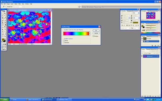 Goto imagen > Ajustes > mapa de degradado. Haga clic en la caja con el degradado ya establecido, debe aparecer otro cuadro de diálogo. En la parte superior es un montón de pendientes, haga clic en el arco iris, si coloca el ratón sobre él debe decir espectro. Hit vale