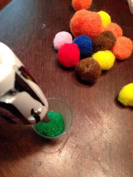 Añada la segunda porción de pegamento en la parte superior primer POM-POM.