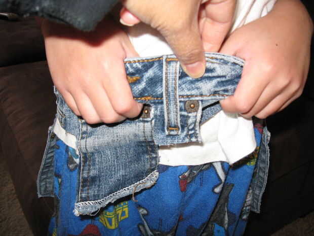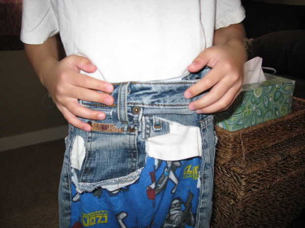 Ahora que se corta la correa del dril de algodón reciclado, usted debe "ajustarla" a su hijo. Yo comentar esto porque yo he cosido desde cerca de 8. Si usted es suficientemente cómoda como para eyeball, grande. De lo contrario, utilice una cinta métrica.