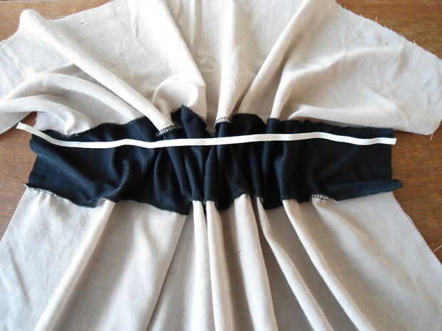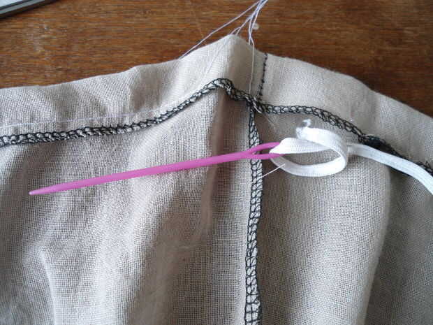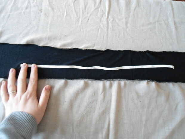 Utilizar una aguja de plástico para la puntada o la mejor herramienta que tienes que meter el elástico! No dejes que vaya demasiado lejos por un extremo coser en el borde de la pieza de tela. Hacer un nudo o coser el otro extremo.