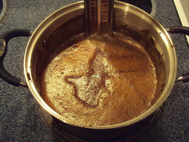 2. agitar y calentar la salsa hasta que llegue a 220 grados en el termómetro de caramelo