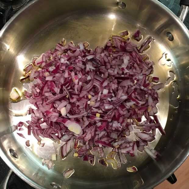 Añadir unas gotas de aceite a la sartén y ponerlo en una Med-alta temperatura. Una vez que el aceite comienza a shimmer, añadir la cebolla picada. Cocinar por unos dos minutos hasta que la cebolla comience a marrón y olor muy bueno.