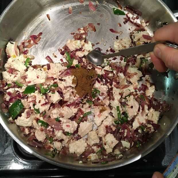 Ahora agregue 2 chiles picados, 1 taza de tofu, 1 cucharadita de sal y 1/2 cucharadita Masalla de Garm.