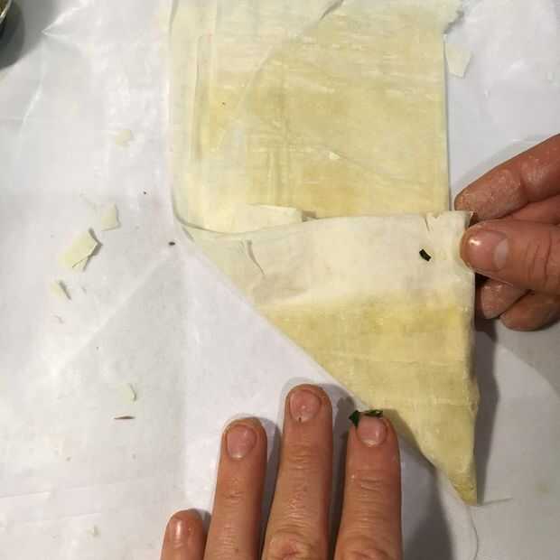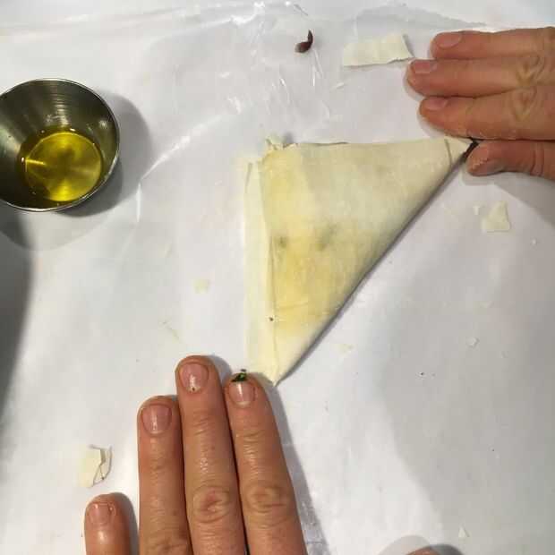 Coloque una de las tiras de filo delante de usted. Añadir una cucharada grande de relleno y doblar una esquina de la hoja de la cuchara. Ahora Levante la parte inferior y sobre y doble el triángulo en forma de bolsa una y otra vez hasta que tenga un triángulo poco aseado. ¡ Hurra!