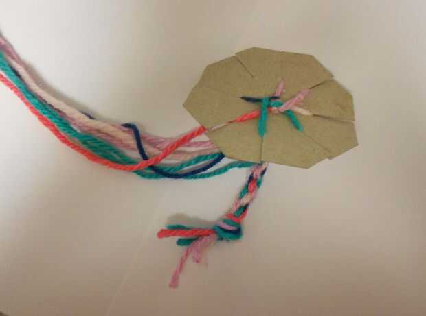 Continuar moviendo el filamento de la tercera de izquierda a derecha en la ranura vacía.  Tu pulsera empieza a forma, suavemente tire a través del orificio hasta que alcance la longitud deseada.