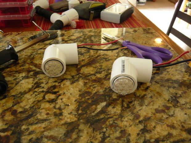 Ok por lo que dependiendo de qué tamaño te luces habrá un desajuste leve a lo 3/4" de apertura por lo que es tiempo de cuña/engordar nuestras luces. Para esto simplemente añadí cinta aislante en incrementos de una pulgada hasta que se hizo un sellado ajustado y luego me deslicé las luces en la parte deslizante de 3'4 "PVC codos hasta con el PVC. Si es necesario corta exceso cinta con cuchilla.