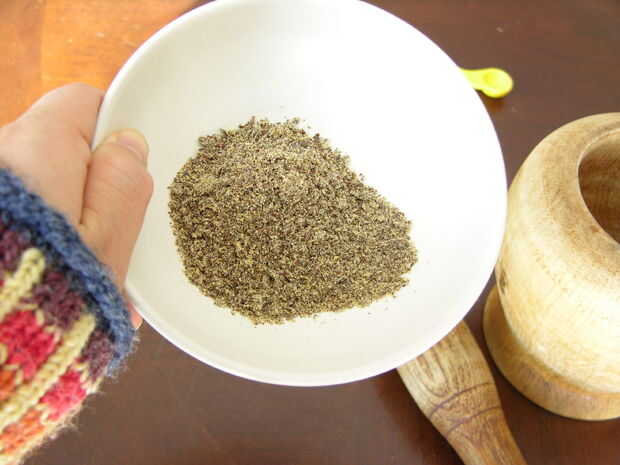 Lugar 1 1/2 cucharadas tostadas semillas de lino y el 1/4 de cucharadita sal en un mortero y una tierra, ponerlo a un lado para su uso.