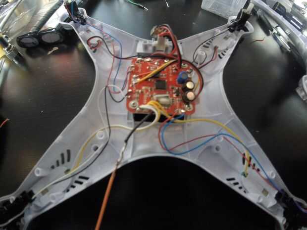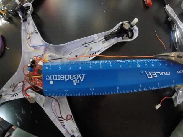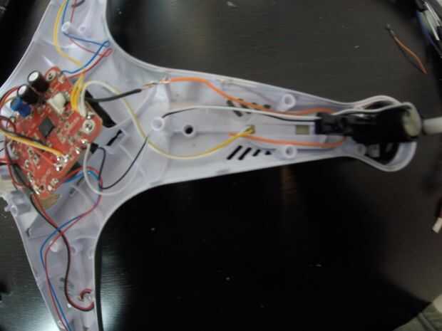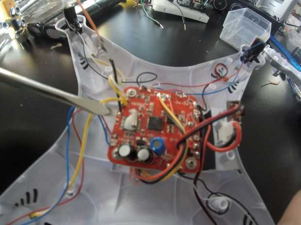 Localizar la antena, es que el destornillador está señalando en la imagen. Pele sobre un centímetro de la cubierta de la antena y un trozo de alambre. El cable debe ser de 12,5 centímetros o más. Girar juntos después de la soldadura. Mide 12,5 centímetros de alambre a partir de la placa de circuito a continuación cortar. Sólo puse la nueva antena en uno de los brazos del quad. Comprobar que es 12,5 centímetros antes de ponerlo de nuevo juntos porque es una longitud de onda completa de 2.4 Ghz. Las fotos podrían ayudar a hacer esto.