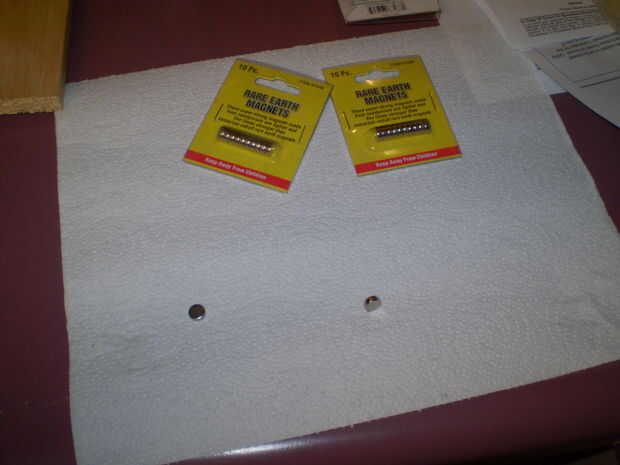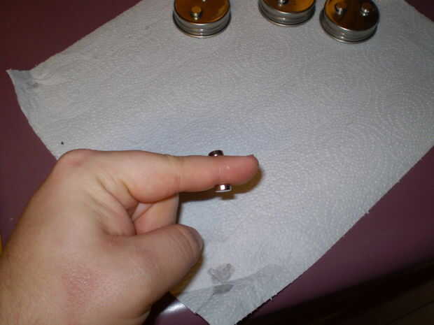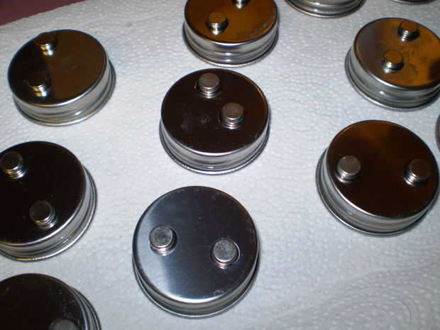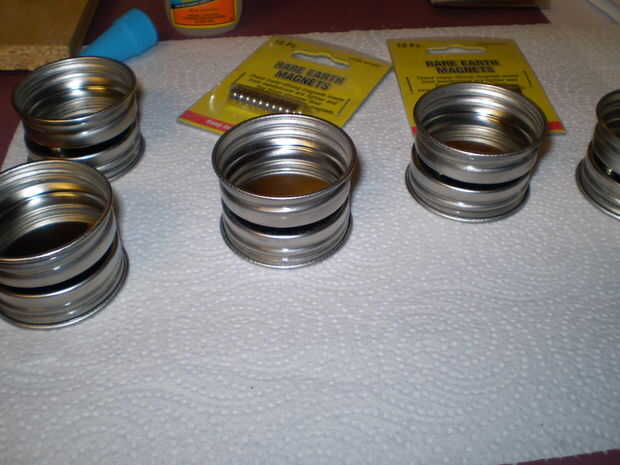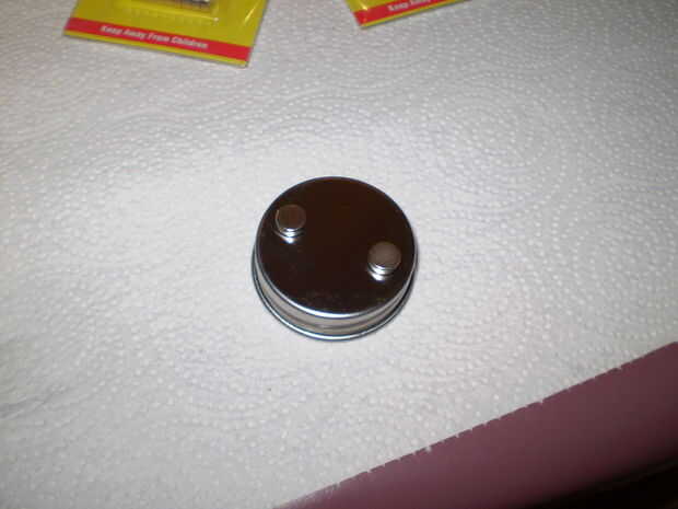En primer lugar, colocar una tapa y poner dos imanes en la parte superior. Luego ponga una gota de pegamento en cada imán. Tomar una segunda tapa y presione hacia abajo sobre la primera tapa. (Debe pegarse naturalmente, puesto que todo en el revoltijo es magnético.) Coloque las dos tapas a un lado para el pegamento fijar. Esto toma aproximadamente 30 segundos.