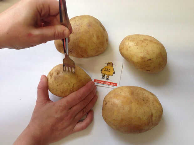 En primer lugar, lavar su patata y les seca con palmaditas. Luego apuñalar sin descanso les con un tenedor. Muy bien, así que no realmente sin descanso, pero necesito a los cuatro o cinco veces cada uno. Es un paso pequeño pero vital - si no lo hace, su copa se convertirá en una Granada, estallando en el horno o el microondas cuando menos te lo esperas. Mientras que los resultados pueden ser sabrosas, es mucho lío para limpiar, y la mayor parte del Papa irá a residuos. Así que atacar a tus papas antes de cocinar!