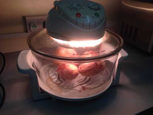 Colocar las patatas en el horno y programar el horno a alta/C 230. Permitir a brown, esto le llevará unos diez minutos. Gire sus papas al menos una vez durante la cocción. Una vez las pieles como usted como ellos, se hacen!