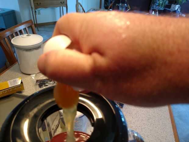Después de que el hígado se ha convertido a una mezcla de rojizo preciosa, añadir 1 huevo.
