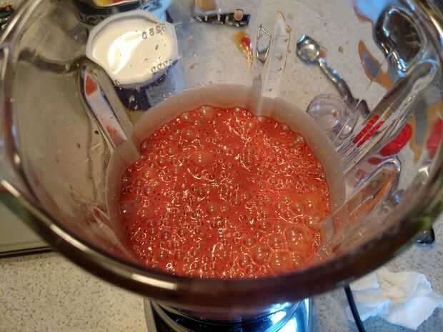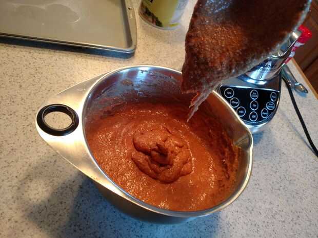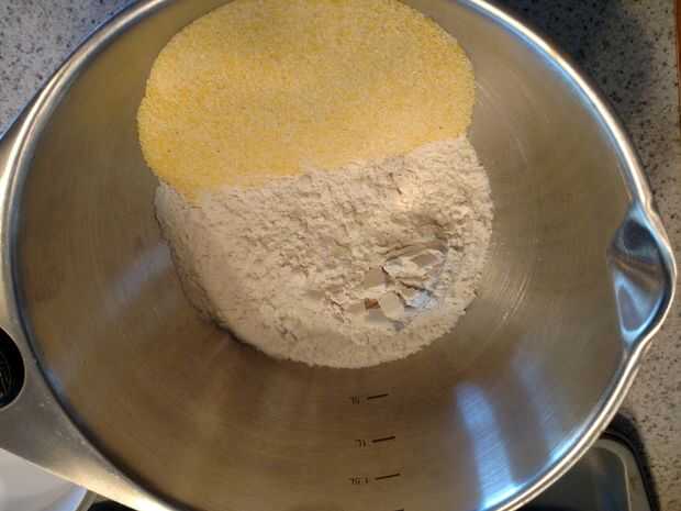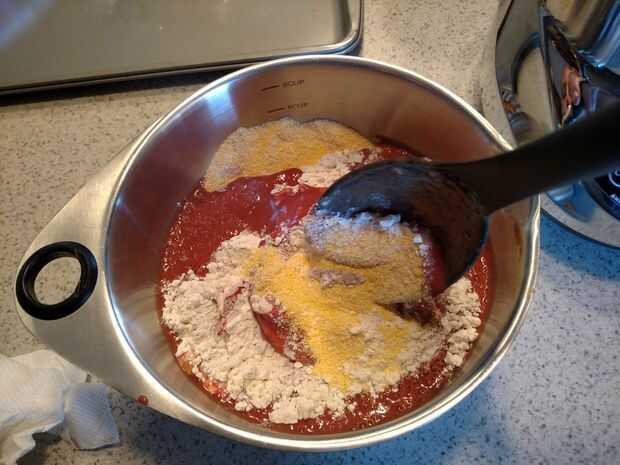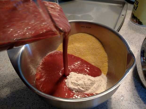 Después de un minuto o de puré, la mezcla debe ser un rojo pálido uniforme. Poner 1 taza de harina y 1 taza harina de maíz en un tazón. Añadir el puré y mezcle bien con una cuchara. Una vez incorporado debe ser la consistencia de la masa de torta gruesa.