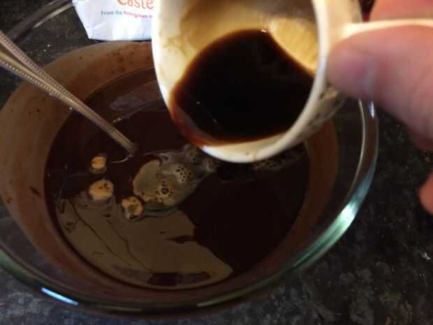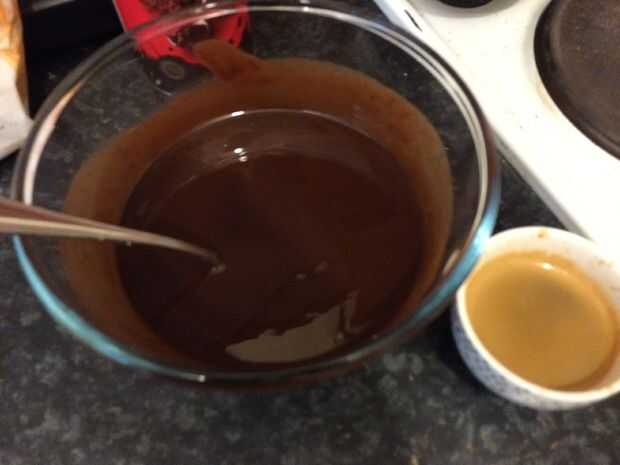 Cuando la mezcla se funde a verter el café y dar una agitación rápida, entonces fijó este tazón de fuente a un lado por ahora.